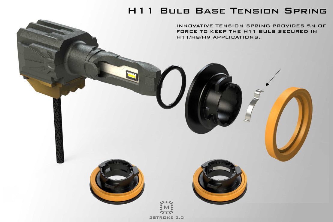 H11 TENSION SPRING: The H11/H9 version of the 2Stroke 3.0 has a particularly special bulb base that's spec'd with an OE-standard tension spring. This pushes the entire bulb base downward with 5nm of force, resulting in a bulb that's been properly seated according to the needs of optics. The tooling required to produce these parts alone was extremely expensive. You'll be hard pressed to find another brand who cares enough to make that kind of investment on this often-overlooked feature.