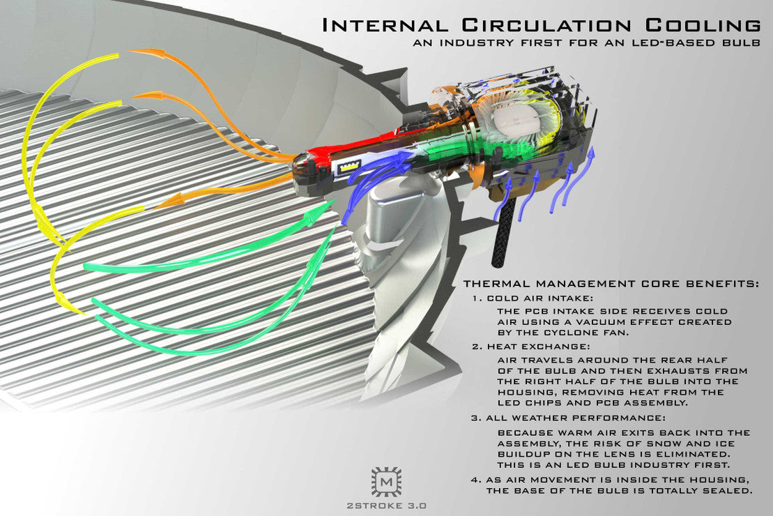 THERMAL MANAGEMENT: Once the bulb is installed, the high-speed fan contained within is completely sealed, making the 2Stroke 3.0 the first actively cooled LED bulb with a fan that's not susceptible to outside elements. Their unique internal circulation cooling system uses a 12,000-rpm cyclone fan to suck cool air into the body of the bulb and blow warm air out, back into the housing. On the intake side, cold air is sucked in past the sidewall of the PCB to exchange heat and is blown out the opposite side of the bulb. This effectively cools the bulb while warming the ambient temperature inside of the housing, increasing resistance to snow/ice buildup on the lens during the winter months. The cooling system on the 2Stroke 3.0 not only does it's job to protect the longevity of the bulb, but serves up a bad-weather benefit not found elsewhere.